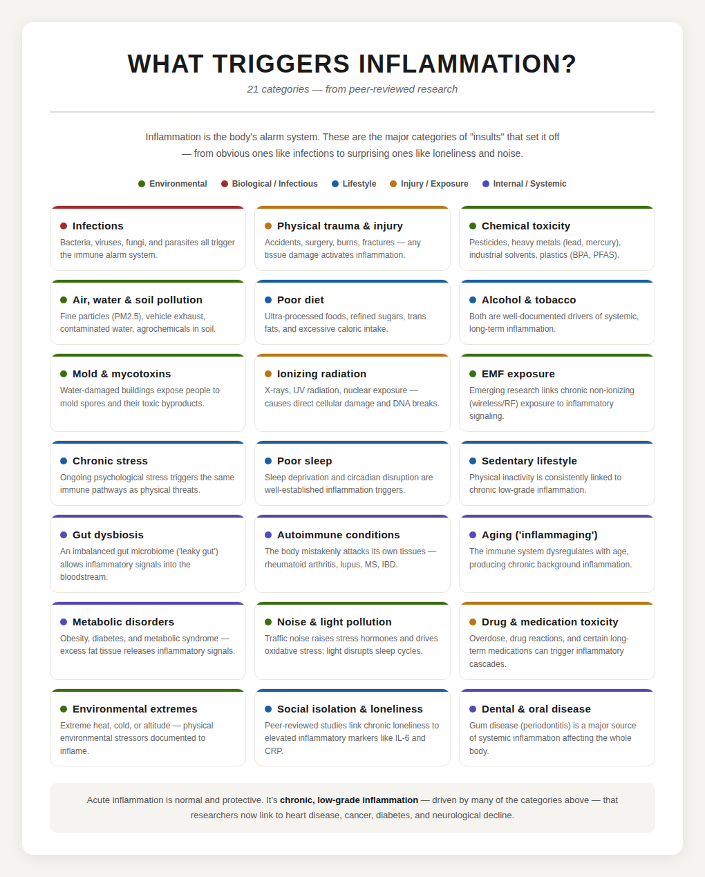 What is fibrosis, and why would I refer to it as a ‘phenomenon’? We’ll get there, but first we need to understand why fibrosis occurs in the first place. You cannot have fibrosis without inflammation. So, to understand fibrosis, you really need to first understand inflammation, realizing that there are literally thousands upon thousands of causes. Here is a list of categories; I have written about all of them at one time or another.