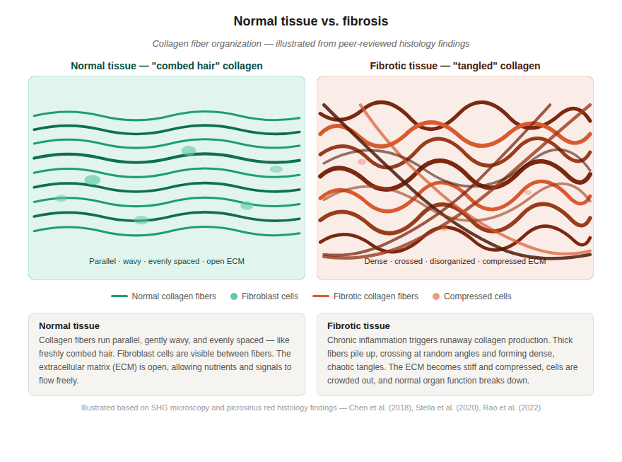 That nonstop signal is exactly what causes fibrosis to begin accumulating. It’s a cycle of dysfunction, inflammation, and fibrosis (repeat) that lays down excess collagen in a random manner, potentially turning healthy connective and muscle tissue into scar tissue. Instead of the neat, combed-hair pattern of healthy tissue, you end up with something more like a hair tangle that is stiff & inelastic, thickened & weak, and painful, even leading to peripheral nerve entrapments.